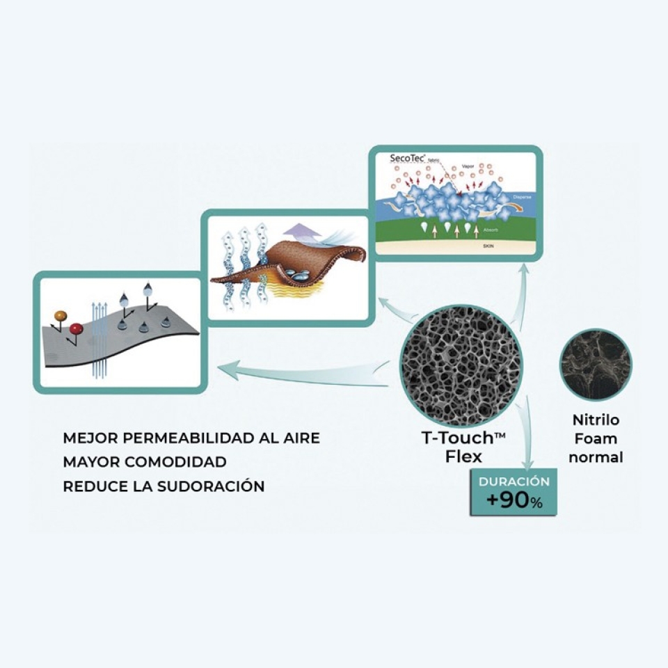 Esa transpirabilidad también se aprecia gracias a la tecnología multicapa nitrilo/PU microfoam T-Touch Flex ®, que también permite la permeabilidad del aire por la zona del recubrimiento.