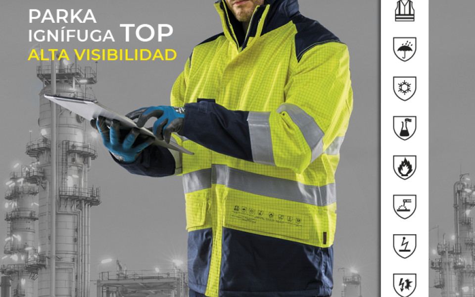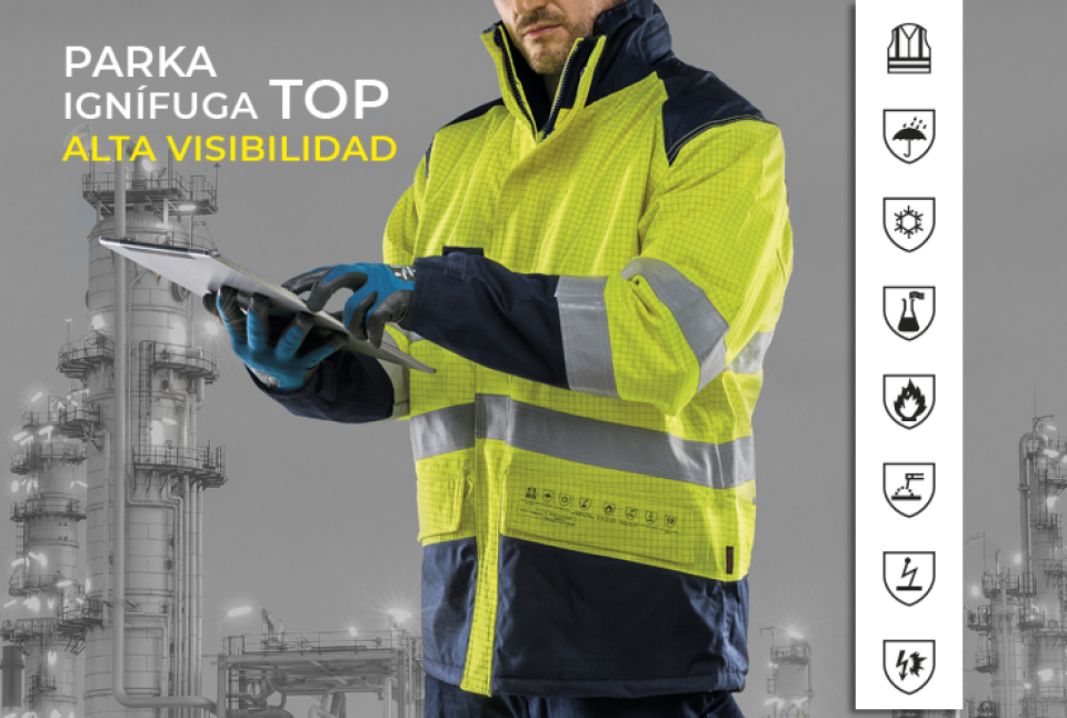 Parka multinorma Ignífuga, alta visibilidad, antiestática de protección contra calor y llama, arco eléctrico, productos químicos líquidos, soldadura, frío y lluvia con altos niveles de protección: